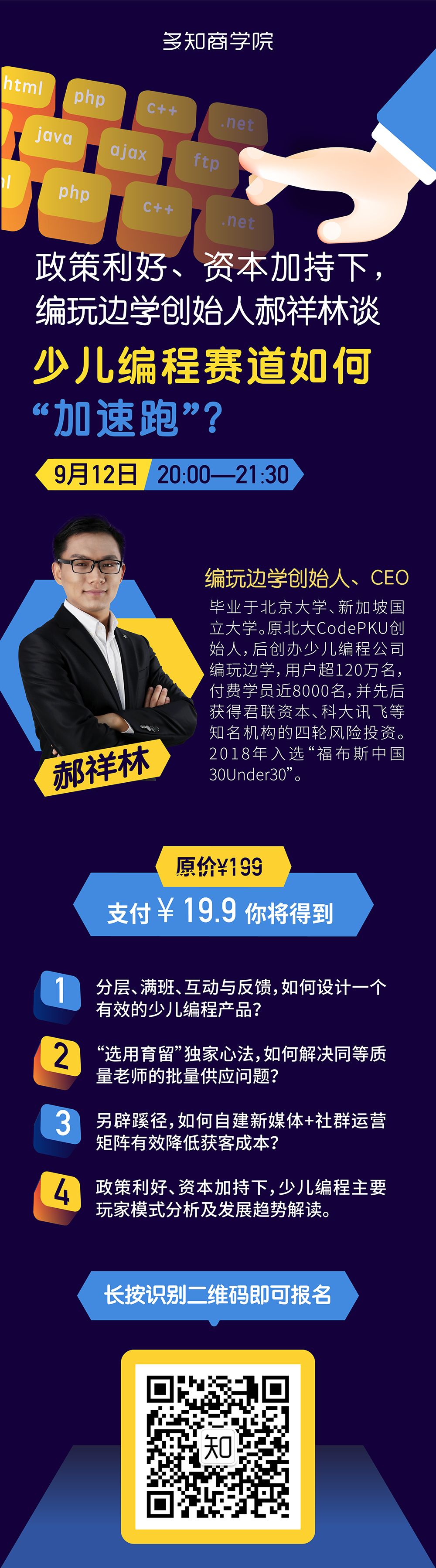 9月12日晚8點(diǎn),編玩邊學(xué)創(chuàng)始人、CEO郝祥林將結(jié)合他在在線少兒編程領(lǐng)域創(chuàng)業(yè)的經(jīng)歷,為你帶來他的獨(dú)家觀點(diǎn)以及深度解答。