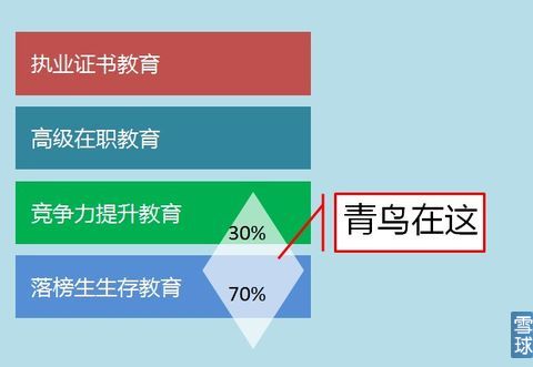 下圖是北大青鳥的客戶結(jié)構(gòu)。曾經(jīng)人人皆知的“學(xué)IT,找工作,就到北大青鳥”,其主要70%的客戶群是高考落榜生,他們也為30%的大學(xué)生提供競(jìng)爭(zhēng)力提升的教育。