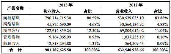 公告披露,華圖宏陽(yáng)主營(yíng)產(chǎn)品和服務(wù)主要包括面授培訓(xùn)、網(wǎng)絡(luò)培訓(xùn)、圖書(shū)發(fā)行和管理咨詢等。2013 年,華圖宏陽(yáng)營(yíng)業(yè)收入9.8億元,其中面授培訓(xùn)營(yíng)收7.9億,占比80.58%;網(wǎng)絡(luò)培訓(xùn)營(yíng)收4587萬(wàn),占比4.68%;圖書(shū)發(fā)行營(yíng)收1.22億元,占比12.5%;管理咨詢營(yíng)收916萬(wàn),占比0.93%;版稅收入1281.8萬(wàn),占比1.31%。2013年歸屬公司股東的凈利潤(rùn)1.2億元,綜合毛利率62.4%。