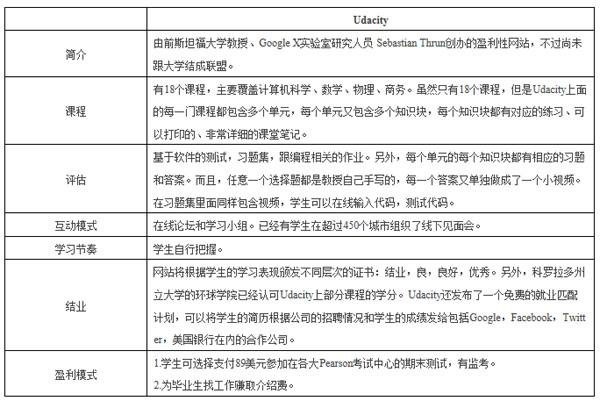 Udacity是由Se-bastianThrun、DavidStavens和MikeSokolsky創(chuàng)建的營(yíng)利組織,該組織也吸引了商業(yè)公司約2100萬(wàn)美元的投資。目前,Udacity共有涉及四個(gè)學(xué)科的20多門(mén)網(wǎng)絡(luò)課程。這些課程將包含衡量課程掌握程度的積分系統(tǒng)等。
