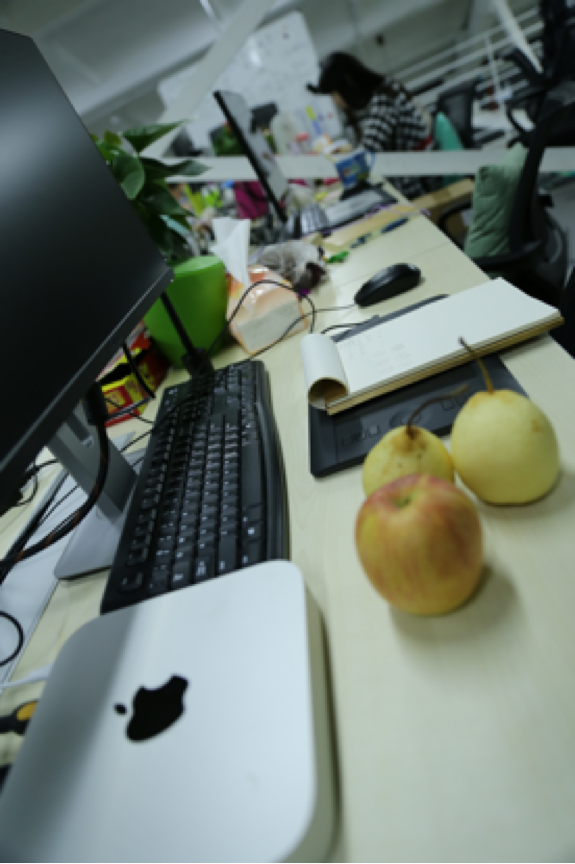 與剛剛經(jīng)過(guò)的區(qū)域相比,這片工作區(qū)稍顯冷清。有意思的是,每個(gè)人的桌子上都有水果和零食——VIPKID每天會(huì)為員工準(zhǔn)備水果。