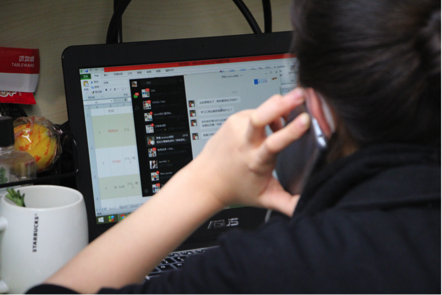課程顧問(wèn)一邊打電話一邊回復(fù)微信,微信界面上還有一排等待回復(fù)的人。