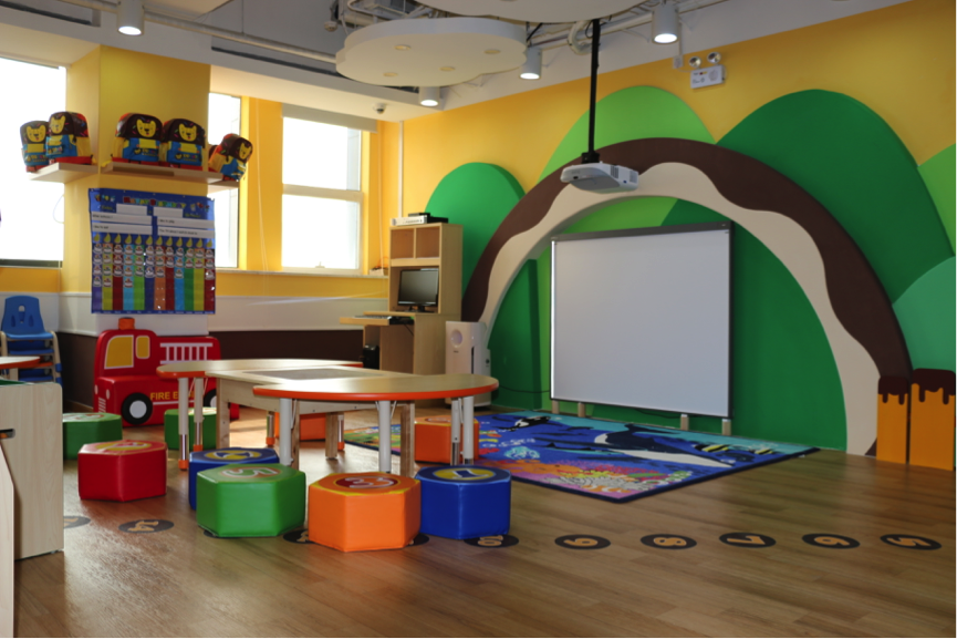 圖為活動(dòng)區(qū)右側(cè),有一些簡單的玩具,墻上掛有互動(dòng)白板。
