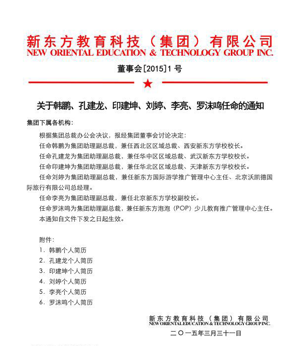 昨天新東方下發(fā)紅頭文件,任命韓鵬、孔建龍、印建坤、劉婷、李亮、羅沫鳴為助理副總裁。其中,除了負(fù)責(zé)優(yōu)能李亮和負(fù)責(zé)游學(xué)的劉婷外,另外四位均為2014年剛?cè)蚊膮^(qū)域總裁。