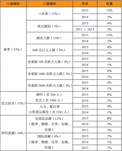在榜單的最后,附上了詳細(xì)的榜單排行的評(píng)價(jià)思路和算法挑戰(zhàn)與亮點(diǎn),在名目繁多的術(shù)語(yǔ)和算法中間,可以找到這樣一句話,核心的評(píng)價(jià)標(biāo)準(zhǔn)是:通過(guò)對(duì)全國(guó)高中2015年及近年學(xué)生生源和升學(xué)數(shù)據(jù)的研究,從高考、自主招生、學(xué)科競(jìng)賽和留學(xué)四個(gè)維度展開(kāi)評(píng)價(jià)排行。
