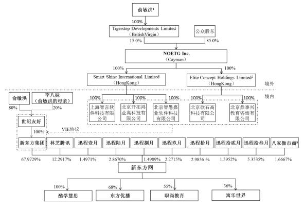由于世紀(jì)友好持有新東方集團(tuán)100%股份,俞敏洪持有世紀(jì)友好 80%股份、俞敏洪的母親李八妹女士持有世紀(jì)友好20%股份,因此,俞敏洪通過(guò)股權(quán)關(guān)系持有新東方網(wǎng)的控股權(quán)。