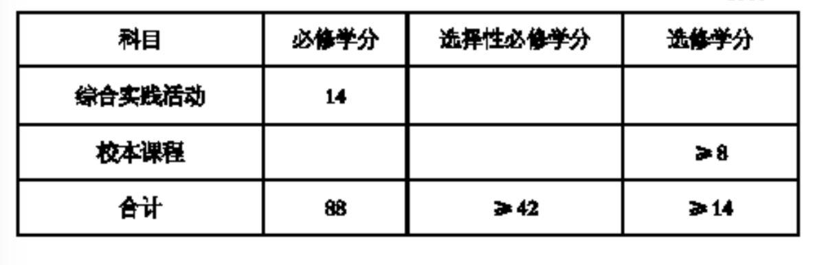 學生完成相應課程規(guī)定課時的學習并考試(考核)合格。即可獲得相應的學分,學生畢業(yè)學分最低要求為144學分,其中必修課程88學分,選擇性必修課程42學分,選修課程14學分,含校本課程8學分。