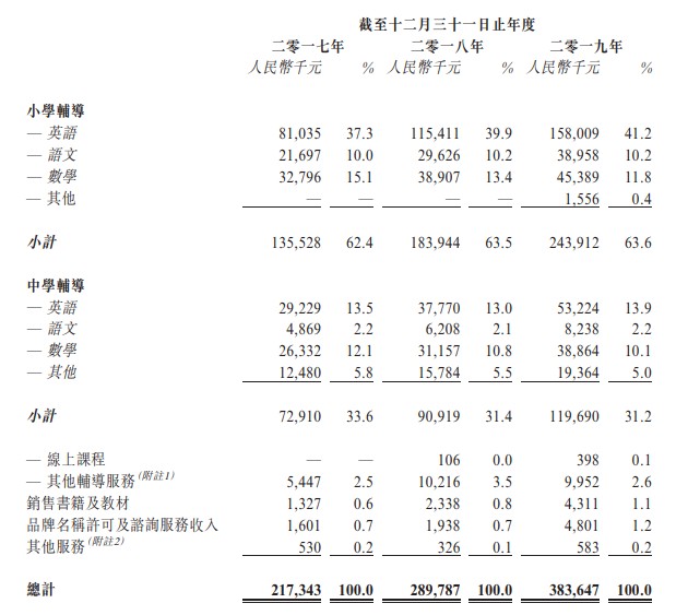 在小學(xué)輔導(dǎo)中,又以小學(xué)英語(yǔ)輔導(dǎo)為最大收入來(lái)源,2019年來(lái)自小學(xué)英語(yǔ)輔導(dǎo)的收入為1.58億元,占大山教育總收入比為41.2%.