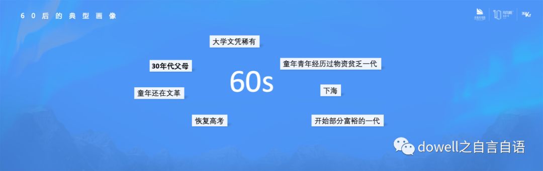 我們?cè)倬唧w看下各個(gè)代際的特征。60后的人如果需要貼一些標(biāo)簽的話,恢復(fù)高考,下??隙ㄊ欠浅V匾臉?biāo)簽,這一代人在童年和青年時(shí)期經(jīng)歷了物質(zhì)比較貧乏的一代,然后完整經(jīng)歷了改革開(kāi)放,其中一小部分人考慮上了大學(xué),也有一些人下海經(jīng)商。這是中國(guó)開(kāi)始富裕的一代。這一代人還有十年左右進(jìn)入退休。