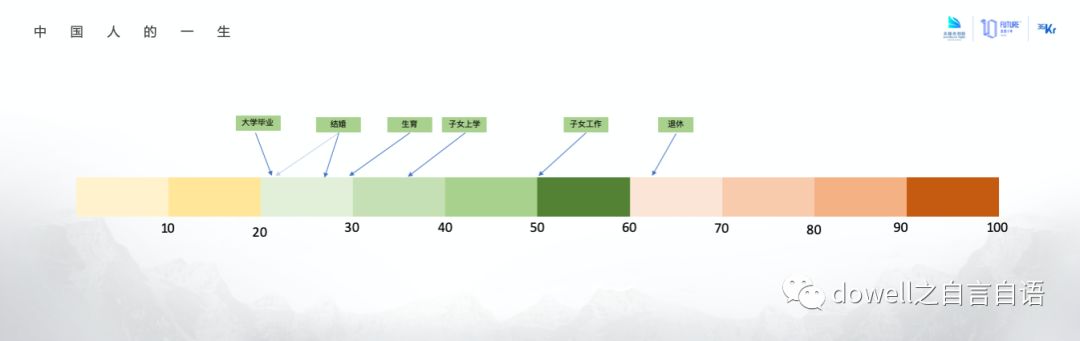 在講代際差之前,我們先來(lái)回顧下中國(guó)人的一生。我們可以簡(jiǎn)單的把人的一生分成三個(gè)階段,第一階段是圖中黃色的部分,我們可以成為被養(yǎng)育階段;第二階段是圖中綠色的部分,我們可以稱之為工作階段;第三階段為圖中棕色部分,我們可以稱之為退休階段。人的一生發(fā)生變化最多的階段是20歲到30歲之間。這個(gè)時(shí)間段你會(huì)從大學(xué)畢業(yè),按滿6周歲進(jìn)入小學(xué)計(jì)算,6歲+小學(xué)6年+初中3年+高中3年+大學(xué)4年=22歲,當(dāng)然中國(guó)還有一些人沒(méi)有進(jìn)入高等教育,他們進(jìn)入社會(huì)工作的時(shí)間會(huì)更早一些。大學(xué)畢業(yè)后進(jìn)入社會(huì)工作,根據(jù)人社部統(tǒng)計(jì)2018年新成長(zhǎng)的勞動(dòng)力為1500萬(wàn),其中高校畢業(yè)生為820萬(wàn)。然后是結(jié)婚,平均結(jié)婚年齡稍微復(fù)雜一些,中國(guó)目前平均初婚年齡是26歲,但性別和地區(qū)差異明顯,男性結(jié)婚年齡會(huì)比女性晚2.3年,發(fā)達(dá)的省份結(jié)婚會(huì)更晚,上海初婚年齡為30歲,女性為28歲,可以預(yù)見(jiàn)的是未來(lái)初婚年齡應(yīng)該還會(huì)變大。再然后是生育,第六次全國(guó)人口普查的結(jié)果顯示,中國(guó)女性的生育年齡為29.13歲(男的結(jié)婚會(huì)晚2年,平均一下差不多在30歲左右),比2000年推遲了2.82歲;可預(yù)見(jiàn)的將來(lái),生育的年齡可能還會(huì)變大。為了讓模型更簡(jiǎn)單一些,我們可以簡(jiǎn)單的把30年稱為一代,那么90后父母為60后,80后養(yǎng)育的是10后。最后是退休,中國(guó)法定退休年齡是男性60歲,女性是55歲,而一些發(fā)達(dá)國(guó)家退休的年齡在65歲左右。為了簡(jiǎn)化模型,我們可以簡(jiǎn)單把人分為10-20歲,20-60歲,60以后分為三個(gè)階段,然后生育年齡設(shè)為30歲。