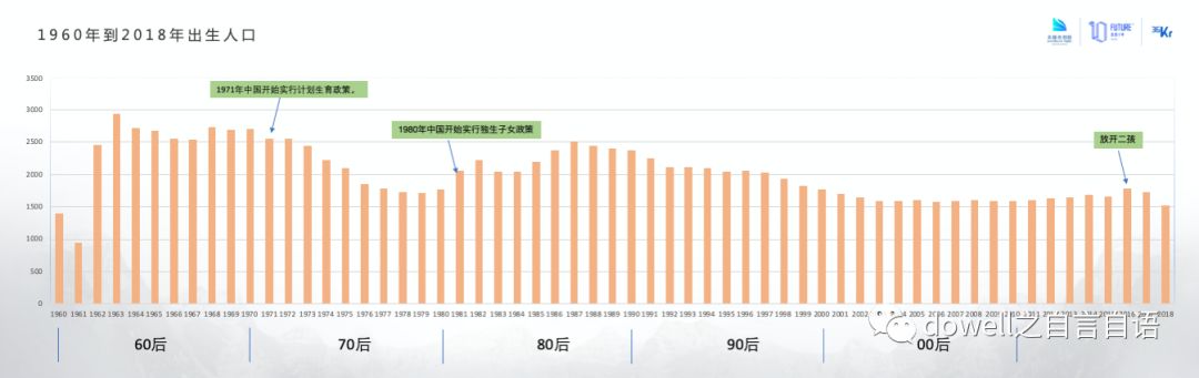 關(guān)注下黃色部分,60后童年和青年時(shí)期經(jīng)歷的是中國(guó)經(jīng)濟(jì)發(fā)展相對(duì)落后的時(shí)期,70后童年經(jīng)歷了經(jīng)濟(jì)相對(duì)落后的階段,然后青年時(shí)期經(jīng)濟(jì)已經(jīng)開(kāi)始發(fā)展,80后出生后經(jīng)濟(jì)開(kāi)始在快速的變好,90年代開(kāi)始生活在相對(duì)富裕的環(huán)境下,00后已經(jīng)誕生在經(jīng)濟(jì)起飛以后了。不同富裕環(huán)境對(duì)人的影響是非常巨大的,如果你一直生活在比較困難的經(jīng)濟(jì)環(huán)境下,你相對(duì)來(lái)說(shuō)會(huì)更節(jié)儉,比如我父母是40年代的人,你想讓他們花錢(qián)很難,今天為他們提供養(yǎng)老的服務(wù),除了死亡恐懼驅(qū)動(dòng)的保健品業(yè)務(wù),其他都會(huì)很難做。在60年代人的年輕時(shí)候的生活記憶里,鄧麗君是不可磨滅的;70年代人的青年的生活記憶是香港四大天皇,在開(kāi)放環(huán)境下,你經(jīng)濟(jì)發(fā)展水平低于外面環(huán)境的時(shí)候,你對(duì)自身的文化是不自信的,然后外來(lái)文化很容易進(jìn)入和流行。你看今天無(wú)論香港的歌曲和影視作品越來(lái)越難在大陸變得像八九十年代那么流行,很大原因是經(jīng)濟(jì)發(fā)展了。反過(guò)來(lái),30年代成立的回力、1990年成立的李寧反而是今天90后喜歡的國(guó)潮品牌。這里面還有更多的影響,大家可以自己再仔細(xì)地分析。