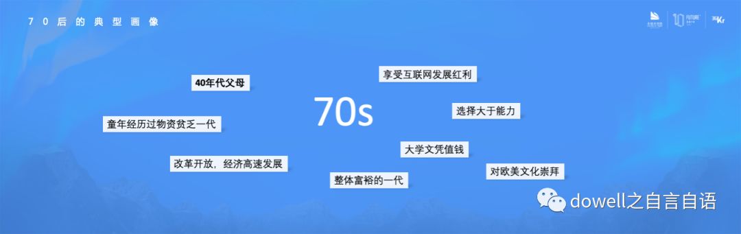 70后某種意義上來(lái)說(shuō)是中國(guó)最幸福的一代,雖然童年經(jīng)歷過(guò)物質(zhì)貧乏,但經(jīng)濟(jì)快速地發(fā)展,從工作以后就享受這經(jīng)濟(jì)高速發(fā)展的紅利。進(jìn)入大學(xué)仍然可以用鯉魚(yú)跳龍門(mén)來(lái)形容,同時(shí)受改革開(kāi)放前的意識(shí)形態(tài)影響比較少,對(duì)歐美文化相對(duì)其他代際是更崇拜一些,小時(shí)候都聽(tīng)著邁克爾杰克遜、四大天王等港臺(tái)明星的歌曲長(zhǎng)大的一代。70后從1992-1993年陸續(xù)開(kāi)始工作,然后經(jīng)歷了互聯(lián)網(wǎng)的高速發(fā)展。我1998年進(jìn)入浙江電信工作,2000年有同事加入了阿里巴巴,我當(dāng)時(shí)還嘲笑他為啥從國(guó)企跳槽去了一家私營(yíng)的互聯(lián)網(wǎng)小公司,幾年前他跟我說(shuō)他退休了,所以這代人因?yàn)闄C(jī)會(huì)多,選擇比能力更重要。