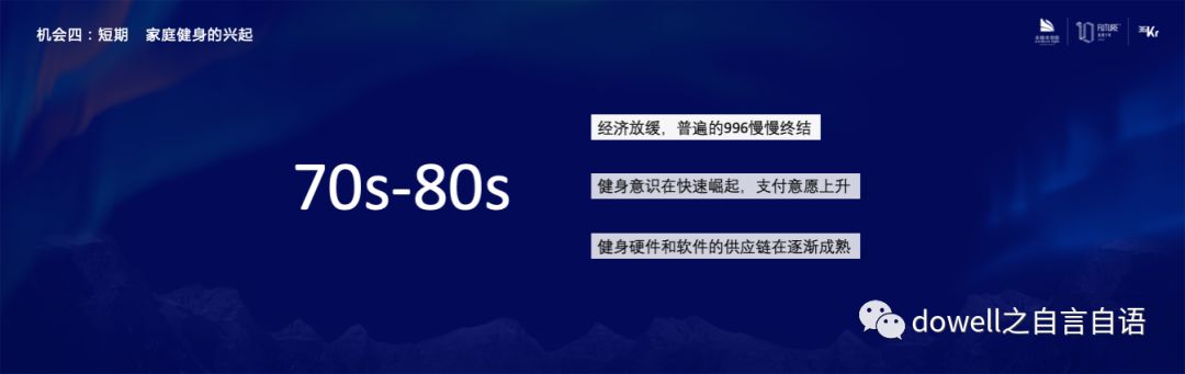 第四個(gè)機(jī)會(huì)是家庭健身會(huì)逐漸興起,相比美國(guó)17%的人有長(zhǎng)期的健身習(xí)慣,中國(guó)有健身付費(fèi)習(xí)慣的用戶只有0.7%,有很好的成長(zhǎng)空間。過(guò)去有一句話,有錢(qián)的沒(méi)閑,有閑的沒(méi)錢(qián),用來(lái)形容健身行業(yè)可能是句很貼切的話。因?yàn)橄鄬?duì)富裕的70后、80后都在996忙著撿錢(qián)。如果經(jīng)濟(jì)不再那么高速發(fā)展,這兩代人可能慢慢就有閑了,就會(huì)開(kāi)始關(guān)注自身的身體狀況,健身會(huì)成為一種生活方式。