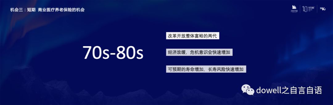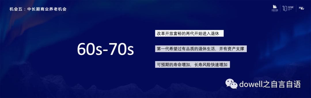 第五個(gè)機(jī)會(huì)是未來(lái)十年的機(jī)會(huì),60年代、70年代的人陸續(xù)進(jìn)入養(yǎng)老,他們相對(duì)前幾代人消費(fèi)的習(xí)慣會(huì)有很大的差異,而且有足夠的錢(qián)。也許今天的40后、50后成長(zhǎng)在經(jīng)濟(jì)相對(duì)不那么發(fā)達(dá)的年代,廣場(chǎng)舞這樣的消費(fèi)會(huì)是一個(gè)節(jié)儉生活方式的選擇,也許60后、70后會(huì)選擇更舒適的退休生活。