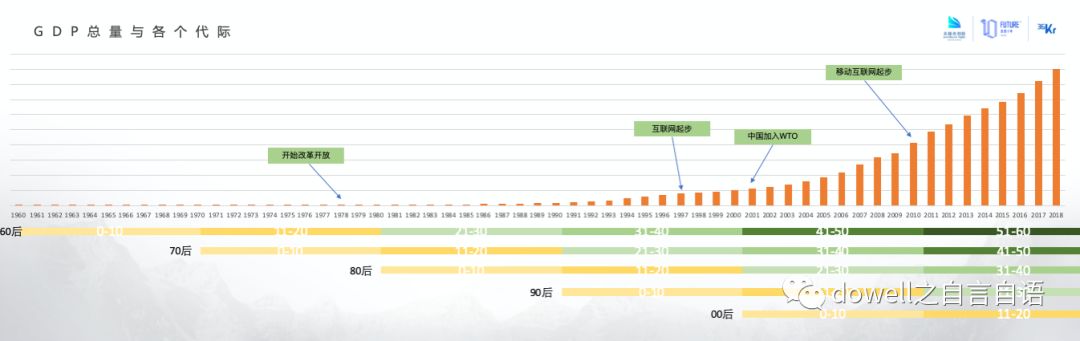 我們?cè)倏匆幌陆?jīng)濟(jì)對(duì)中國(guó)不同代際的影響,重要的幾個(gè)事件我標(biāo)示在圖上,1978年中國(guó)開(kāi)始實(shí)行改革開(kāi)放,1997年互聯(lián)網(wǎng)進(jìn)入大家的視野,2000年后互聯(lián)網(wǎng)開(kāi)始高速發(fā)展,2001年中國(guó)加入了WTO,1997年iPhone開(kāi)始投產(chǎn),而移動(dòng)互聯(lián)網(wǎng)真正的爆發(fā)開(kāi)始于2010年。從1978年開(kāi)始,40年的改革開(kāi)放中國(guó)GDP的總量劃出了一個(gè)非常漂亮的上翹的曲線。