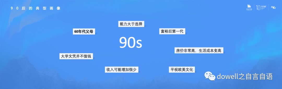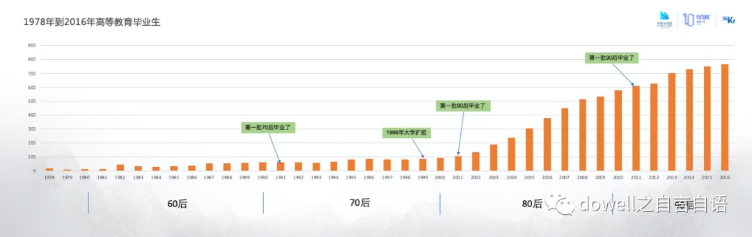 90后的父母是開(kāi)始富裕的60后,出生后的家境相對(duì)都會(huì)比較殷實(shí),家境的殷實(shí)使得對(duì)本土的文化更加自信,所以對(duì)歐美港臺(tái)的文化更加平視。他們開(kāi)始工作的時(shí)候,能夠攢錢(qián)到首付的時(shí)候,房?jī)r(jià)已經(jīng)比較高了,隨著經(jīng)濟(jì)發(fā)展放緩,他們可能在未來(lái)的收入不會(huì)像過(guò)去幾代人一樣快速的增加。大學(xué)生的比率已經(jīng)在同齡人里面占比到了40%,對(duì)他們來(lái)說(shuō)考上大學(xué)不是問(wèn)題,但985,211的學(xué)校才作數(shù)。大的機(jī)會(huì)在消失,慢慢會(huì)變成能力大于選擇。
