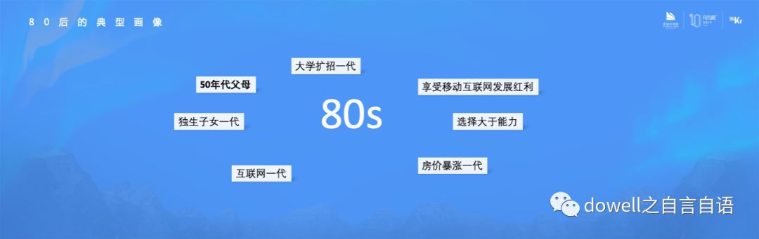 80后是經(jīng)歷最多政策調(diào)整的一代。1986年的義務(wù)制教育頒布,1999年大學(xué)擴(kuò)招都是為這代人設(shè)計(jì)的,是義務(wù)教育和高等教育快速普及的一代。他們又是獨(dú)生子女的第一代。子女開(kāi)始進(jìn)入幼兒園和小學(xué),對(duì)子女的教育會(huì)非常重視。高中和大學(xué)就開(kāi)始接觸互聯(lián)網(wǎng),是互聯(lián)網(wǎng)第一代的原住民,工作以后2010年開(kāi)始移動(dòng)互聯(lián)網(wǎng)的爆發(fā)使得他們能夠享受了互聯(lián)網(wǎng)發(fā)展的紅利,仍然是選擇大于能力的一代。這一代人最大的經(jīng)濟(jì)壓力來(lái)自于房?jī)r(jià)的暴漲。