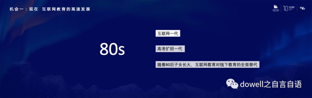 第一個(gè)機(jī)會(huì)是當(dāng)前正在發(fā)生的互聯(lián)網(wǎng)教育的機(jī)會(huì)。今天80后正在成為互聯(lián)網(wǎng)教育消費(fèi)的主力。我們2015年投資了VIPKID,2018年投資了火花思維;這兩家公司后來(lái)的增速都超過(guò)了當(dāng)時(shí)公司的商業(yè)計(jì)劃提供的預(yù)測(cè)的數(shù)據(jù)。有個(gè)LP(VC的投資人)問(wèn)我一個(gè)問(wèn)題,如果他們發(fā)展超過(guò)預(yù)期,你低估了什么,也許低估了80后對(duì)互聯(lián)網(wǎng)教育的需求。因?yàn)榻衲晏?0后是大學(xué)擴(kuò)招后的一代,高學(xué)歷的家長(zhǎng)會(huì)更重視子女的教育。同時(shí)他們作為互聯(lián)網(wǎng)的第一代原住民,更傾向于會(huì)選擇線上的教育。我相信隨著這些家長(zhǎng)的子女陸續(xù)長(zhǎng)大,那么互聯(lián)網(wǎng)教育對(duì)線下教育的替代正在快速地發(fā)生。