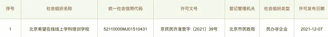 截至日期將至,12月7日,北京民政局行政許可公示新增注冊5家民辦非企業(yè)類型線上學科培訓學校。民辦非企業(yè)單位是指企業(yè)事業(yè)單位、社會團體和其他社會力量以及公民個人,利用非國有資產(chǎn)舉辦的從事非營利性社會服務(wù)活動的社會組織。也就是說,樂學東方、希望在線、志道、猿輔導線上學科培訓學校、作業(yè)幫線上學科培訓學校五家均為非營利性組織。