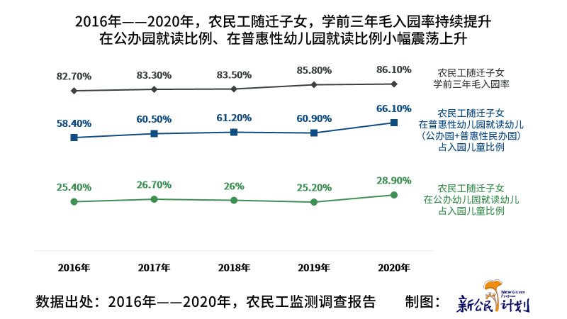從2016年開始,國家統(tǒng)計局在每年發(fā)布的《農(nóng)民工監(jiān)測調(diào)查報告》中,都有披露農(nóng)民工隨遷子女接受學前教育的情況。2016年——2020年,農(nóng)民工隨遷子女進入公辦園就讀的比例略高于25%,近3/4的農(nóng)民工隨遷子女在民辦幼兒園就讀,在普惠性幼兒園(公辦園+普惠性民辦園)就讀的比例在60%左右?! ?/p>