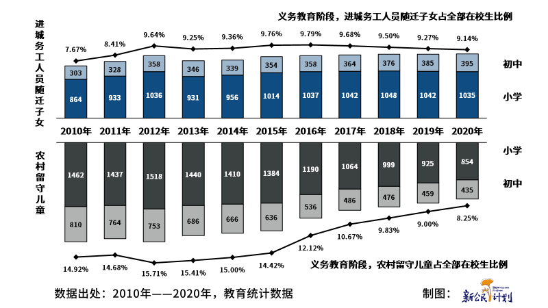 隨著流動人口規(guī)模的增長,中國流動人口子女規(guī)模同步增長,2020年,中國流動人口子女規(guī)模約1.3億人(參考《2015年中國兒童人口狀況,事實與數(shù)據(jù)》,《第七次人口普查數(shù)據(jù)公報》,《2015年-2020年,教育統(tǒng)計資料》估算),超過中國兒童總數(shù)的40%。對于許多流動人口家庭來說,把孩子帶在身邊成為流動兒童,在居住地城市會面臨各種入學、升學方面的困難;送回“老家”成為留守兒童,就不能親自養(yǎng)育和陪伴孩子的成長,對于每個流動中的家庭來說,“流動”還是“留守”是一個兩難的選擇。