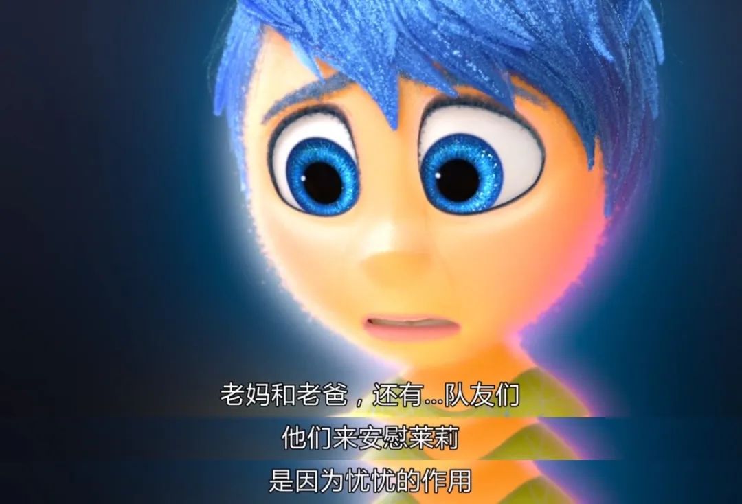樂樂原本也認(rèn)為憂憂是消極的、不該存在的,她看到的關(guān)于萊莉的冰球記憶里只有代表快樂的黃色,是憂憂的觸碰讓記憶球變色。但樂樂在被困在記憶深處時卻突然發(fā)現(xiàn),記憶球原本就有藍(lán)色,這一整段完整的記憶是:萊莉在冰球選拔中沒發(fā)揮好,心里很難過,爸爸媽媽因為看到萊莉的難過才來安慰她,小伙伴們也把她高高地拋起。
