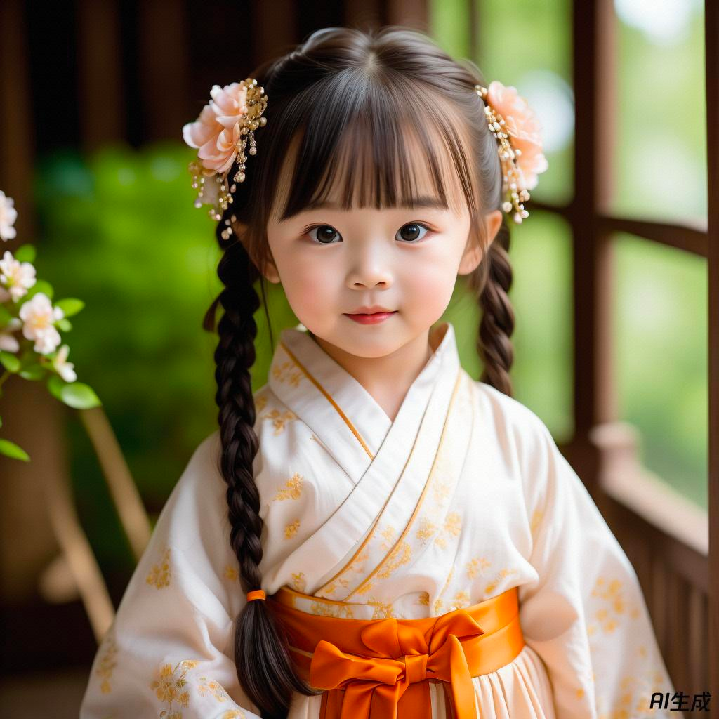 生成可愛的亞洲 4 歲女孩穿著棉質連衣裙,大眼睛,古代中國,攝影風格,漢服