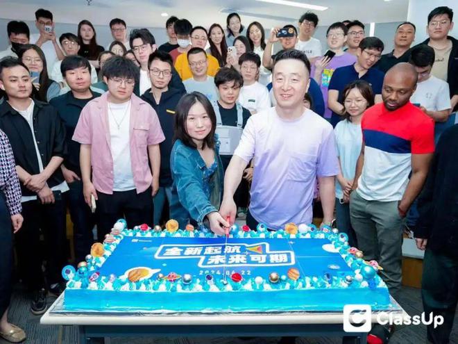4月22日,在ClassUP藍(lán)色基調(diào)的辦公室中,一張桌子上擺了一個(gè)碩大的長(zhǎng)方形藍(lán)色蛋糕,中間用白色奶油寫(xiě)著“全新起航,未來(lái)可期”8個(gè)大字,蛋糕上還有星球和火箭的裝飾,寓意重新出發(fā),也象征著目標(biāo)是“星辰大海”,攝影師把帥科和聯(lián)合創(chuàng)始人Annie Chen準(zhǔn)備切蛋糕的畫(huà)面定格了下來(lái)。