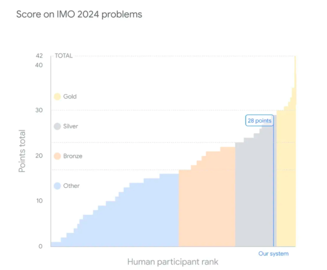(圖表顯示了谷歌AI 模型在 IMO 2024 中相對(duì)于人類競(jìng)爭(zhēng)對(duì)手的表現(xiàn),其獲得了總分 42 分中的 28 分,達(dá)到與比賽中銀牌得主相同的水平。)