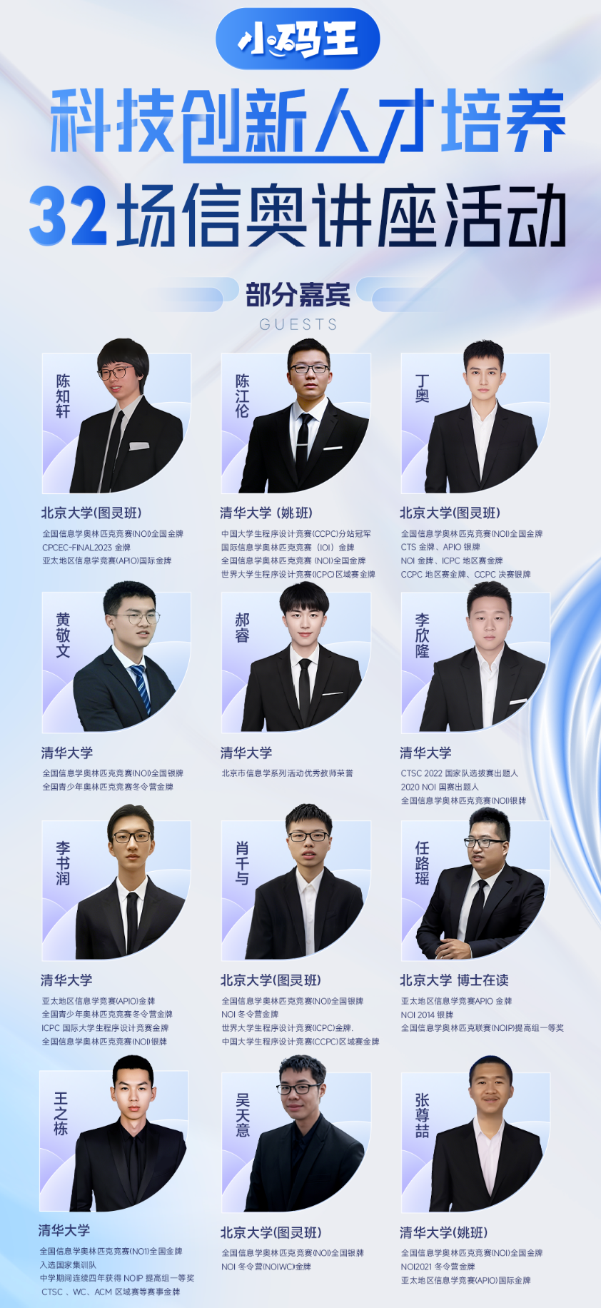 在籌備過程中,小碼王邀請了來自全國各地的信息學(xué)奧賽金牌教練、知名專家學(xué)者以及行業(yè)內(nèi)的領(lǐng)軍人物作為講師團(tuán)成員,他們將結(jié)合自己的實(shí)戰(zhàn)經(jīng)驗(yàn)與教學(xué)心得講授信奧“干貨”。