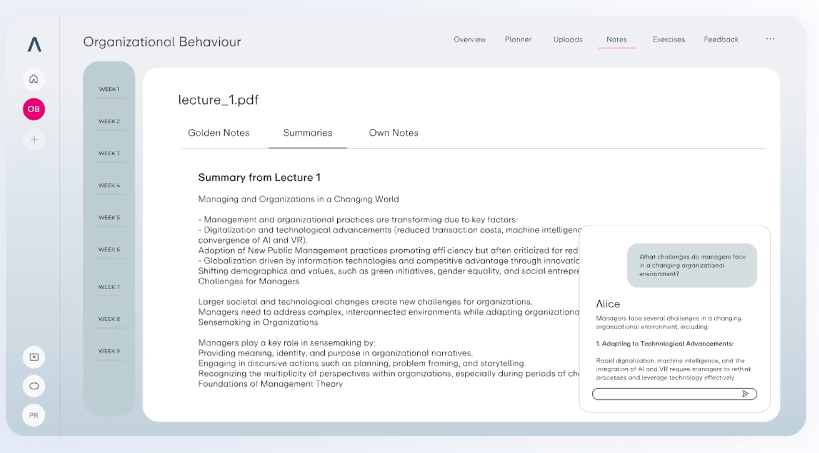 Alice將人工智能內(nèi)容生成與自適應(yīng)學(xué)習(xí)相結(jié)合,根據(jù)學(xué)生上傳的學(xué)習(xí)資料生成個性化的筆記、總結(jié)、練習(xí)測驗(通過選擇題、抽認卡、開放式問題、考試模擬進行練習(xí))和輔導(dǎo)。學(xué)生可以實時了解自己的學(xué)習(xí)進度和需要改進的地方,并通過Alice的“與朋友一起學(xué)習(xí)”功能進行協(xié)作、分享學(xué)習(xí)資料并保持學(xué)習(xí)動力。