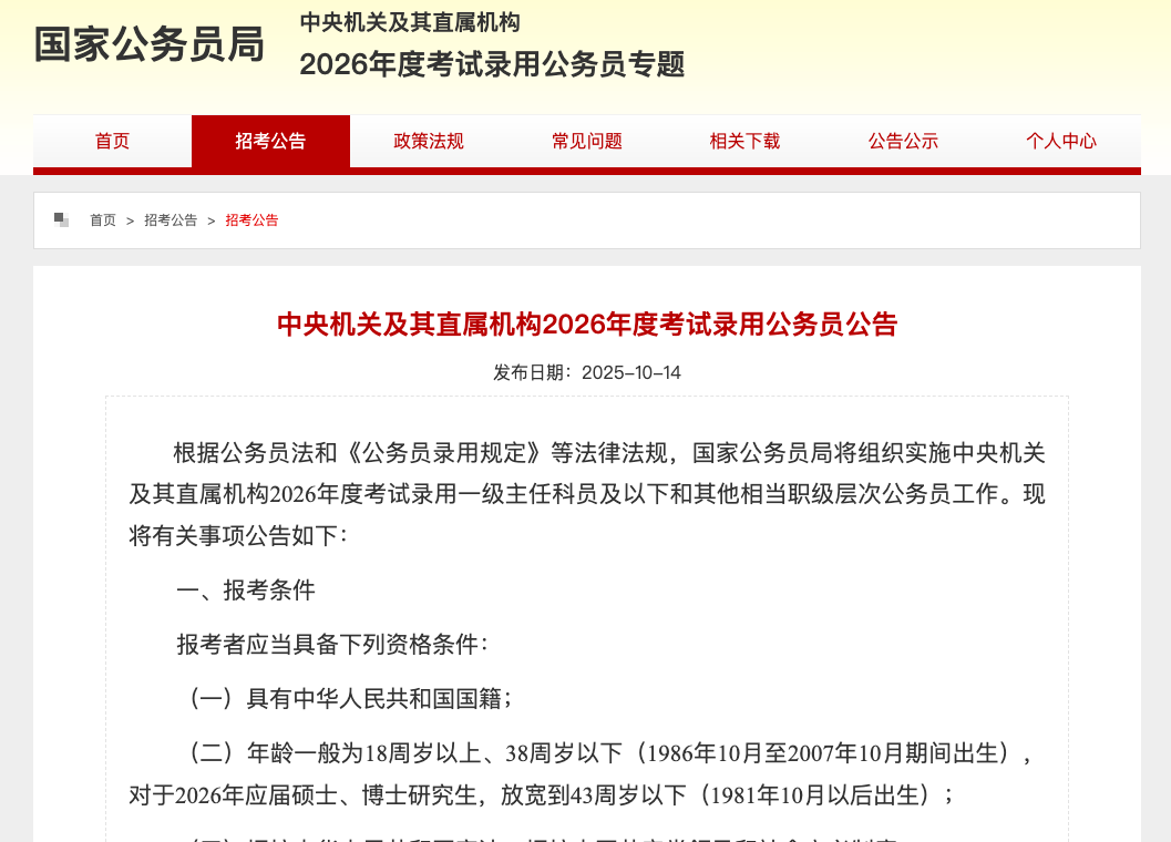 值得關(guān)注的是,與往年不同,按照實(shí)施漸進(jìn)式延遲法定退休年齡有關(guān)政策要求,本次國(guó)考對(duì)公務(wù)員招錄年齡條件作了適當(dāng)放寬調(diào)整,明確年齡要求為——年齡一般為18周歲以上、38周歲以下(1986年10月至2007年10月期間出生),對(duì)于2026年應(yīng)屆碩士、博士研究生,放寬到43周歲以下(1981年10月以后出生)。