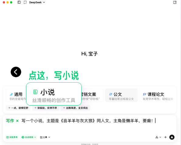 目前,該功能已在元寶手機端、電腦版和網(wǎng)頁版同步開放。電腦版輸入“@”后選擇“寫作”,手機端點擊輸入框旁的“+”號進入“寫作模式”,選擇“寫小說”, 只需像聊天一樣把想法告訴元寶,就能完成長篇創(chuàng)作。