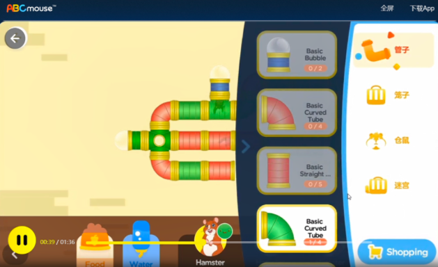 而ABCmouse則建立了獨特的“家園系統(tǒng)”以承載多樣的道具獎勵,展示了成長體系中資源積累的吸引力。在“我的小屋”欄目中,用戶可以進(jìn)行DIY裝修,也可以養(yǎng)小狗、倉鼠、魚等各種寵物,還有與寵物相關(guān)的益智類小游戲。