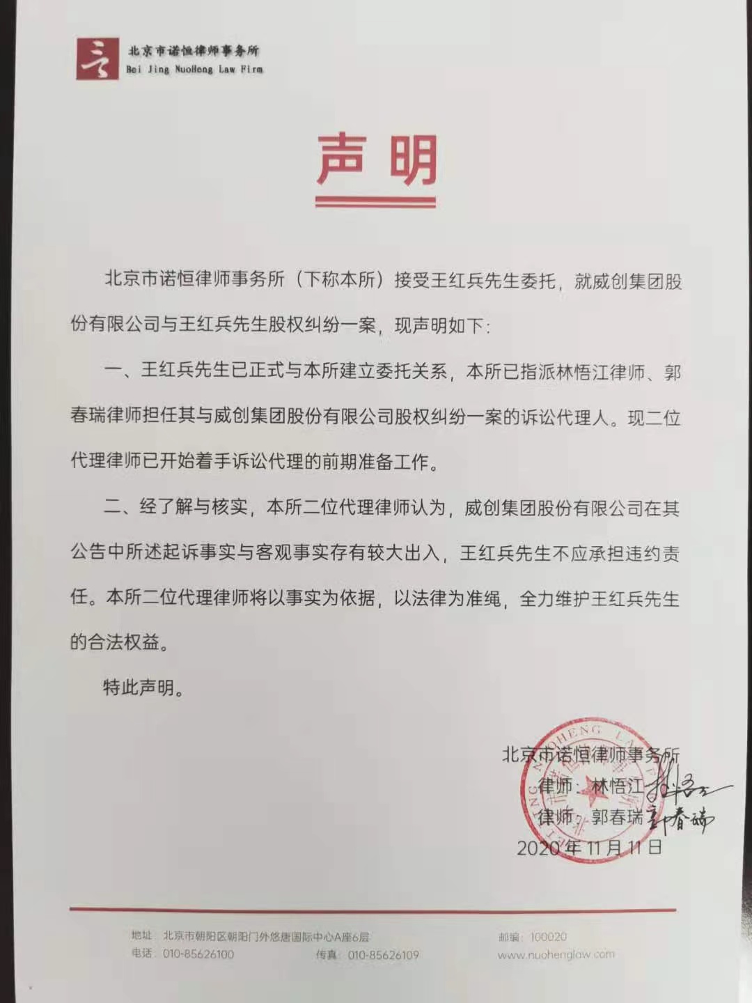 多知網(wǎng)11月14日消息,繼威創(chuàng)發(fā)布公告,起訴王紅兵之后,王紅兵委托北京諾恒律師事務所發(fā)布《聲明》。《聲明》指出,威創(chuàng)在公告中所述起訴事實與客觀事實有較大出入,王紅兵不應承擔違約責任,目前兩位代理律師已開始著手訴訟代理的前期準備工作。